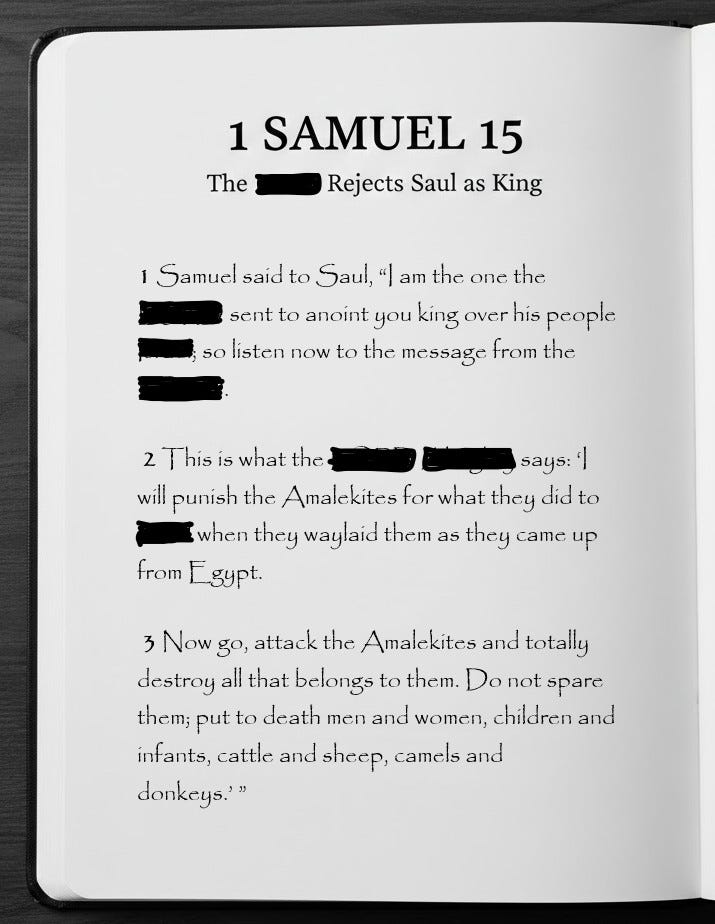 Which brings us to the meme I’ve created for this post: the redaction of the Bible, specifically 1 Samuel 15.